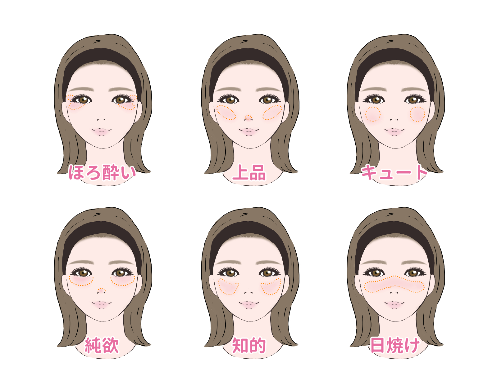 • 逆三角形: 頬の中心に丸く入れると優しい印象に。
