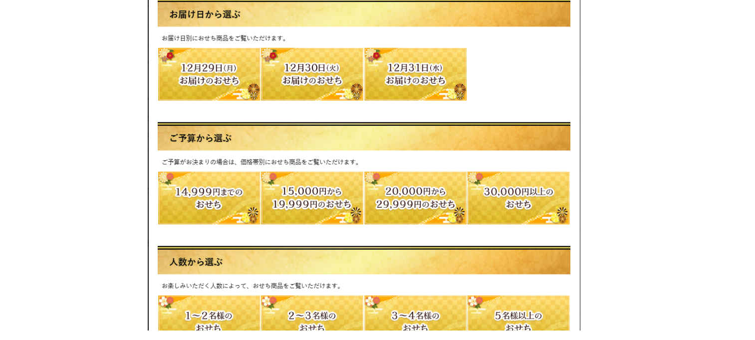 「家族で手軽に楽しみたい」「豪華な三段重で迎えたい」など、目的に合った価格帯でスムーズに選べるのが嬉しいポイントです。