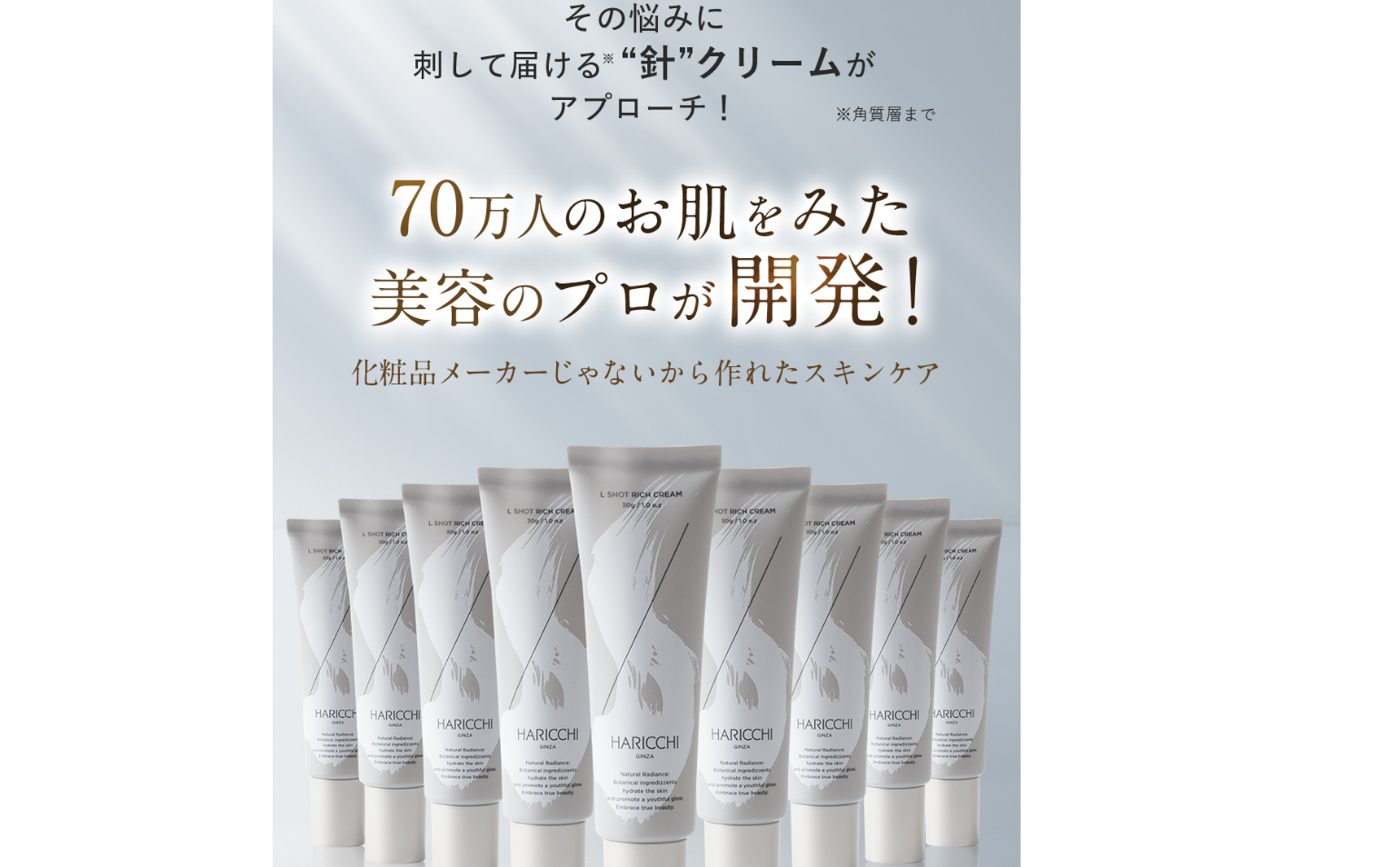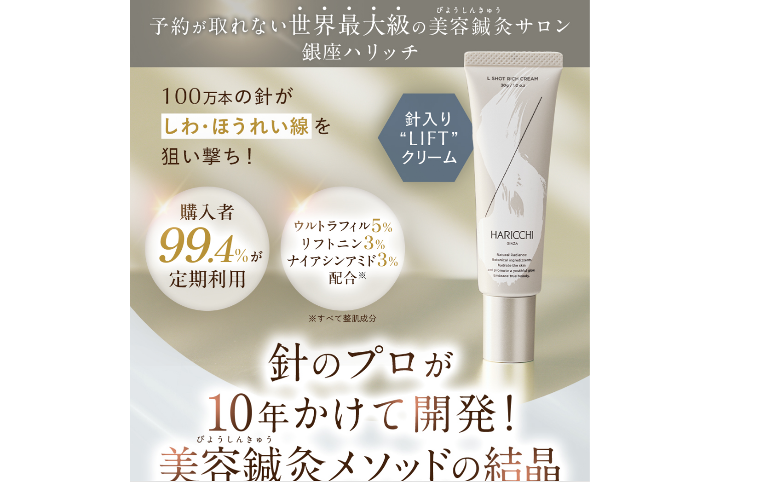 年齢とともに深くなるほうれい線、目元の小ジワ、フェイスラインのたるみ。毎日のケアで“見た目年齢”を変えたい方へ。多くの芸能人・モデルが愛用し、TVや雑誌で話題の〈銀座ハリッチ HARICCHI〉が開発したエイジングケアクリーム「L shot リッチクリーム」は、海や淡水に生息する生物から抽出した天然の“微細針”成分と、高機能なリフトアップ成分を配合した“塗る美顔鍼”です。
